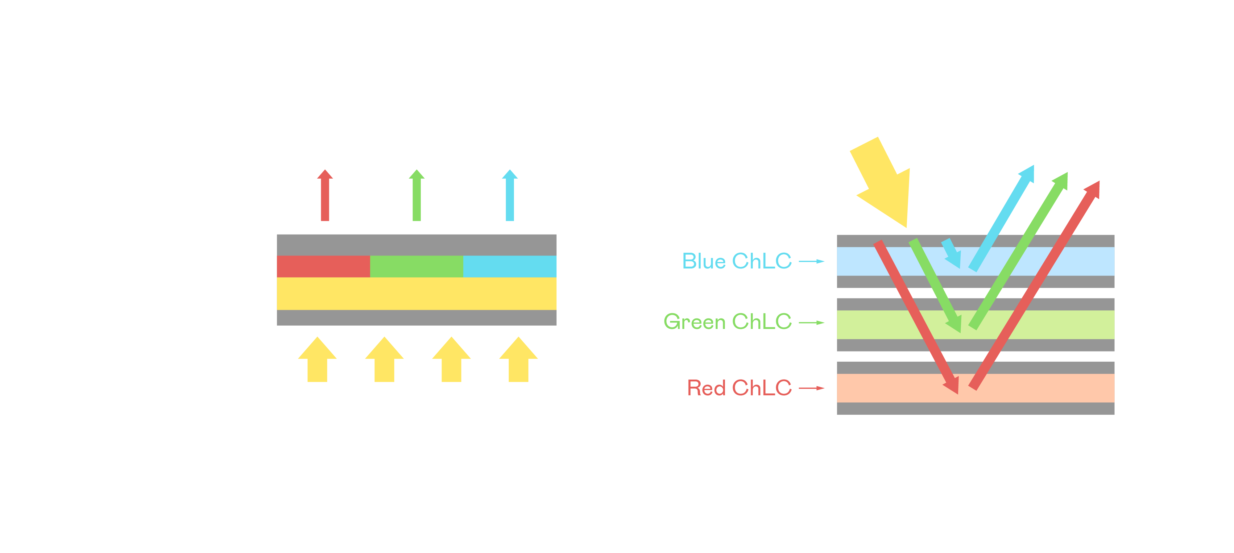 Top1体育胆固醇液晶显示器是由红、绿、蓝三层胆固醇液晶面板堆叠而成,并采用无彩色滤光片设计,减少环境光在反射过程中的损耗。